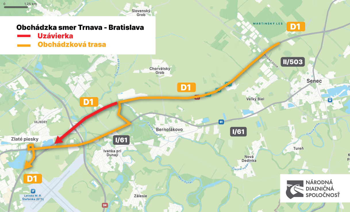 Národná diaľničná spoločnosť pripomína avizovanú jednosmernú uzáveru D1 pri Bratislave. Uzávera sa začne už dnes večer (9.4.) približne o 22:00 a potrvá do nedeľného večera (12.4.). Diaľnica bude uzatvorená od križovatky Bernolákovo (Triblavina) po bratislavské Zlaté Piesky. Práce budú prebiehať len v smere do Bratislavy, v opačnom smere ostáva doprava nezmenená.